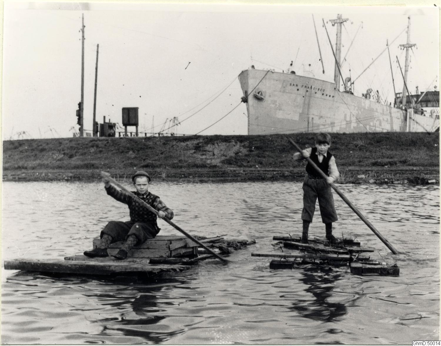 2 stycken pojkar på varsin flotte i Lundbyhamnen.