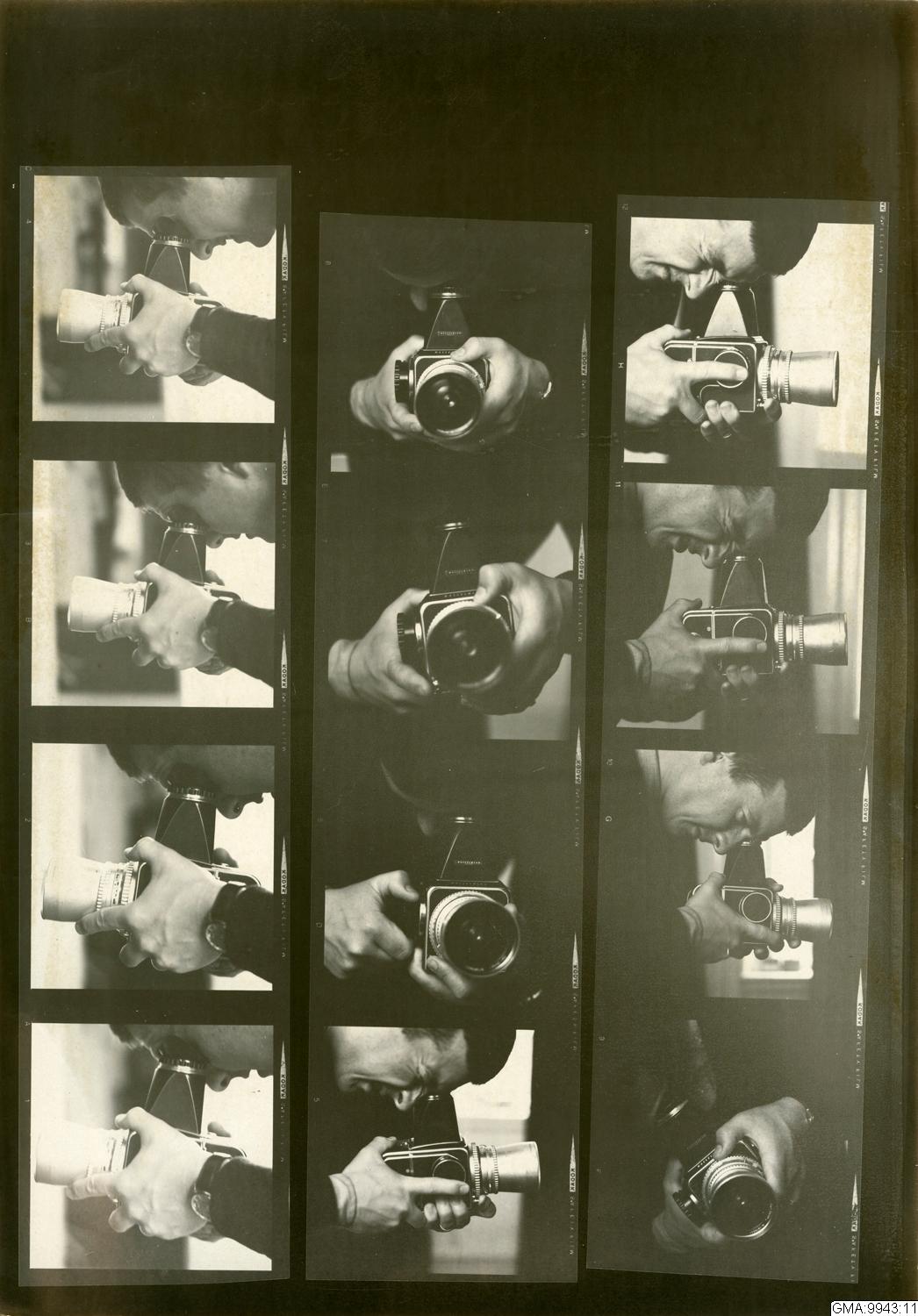 Kontaktkopia med 9 st bilder med fotografering av fotograf med kamera. Från negativ 6 x 6 cm. troligen