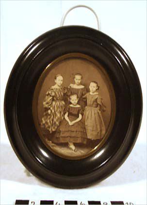 Betty Grén t.v. i rutig klänning med kamrater. foto omkring 1860.