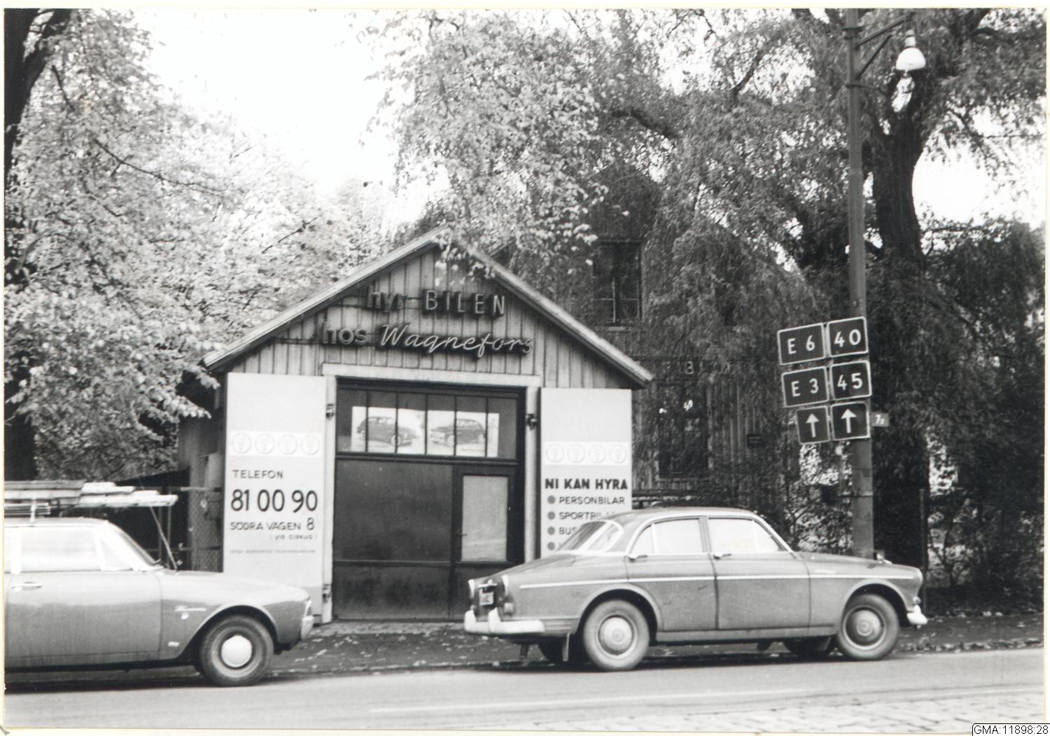 Den tidigare brandstationen vid Krokslätts fabriker, på västra sidan av Mölndalsvägen. På 1960-talet har biluthyrningsfirman Wagnefors tagit över.