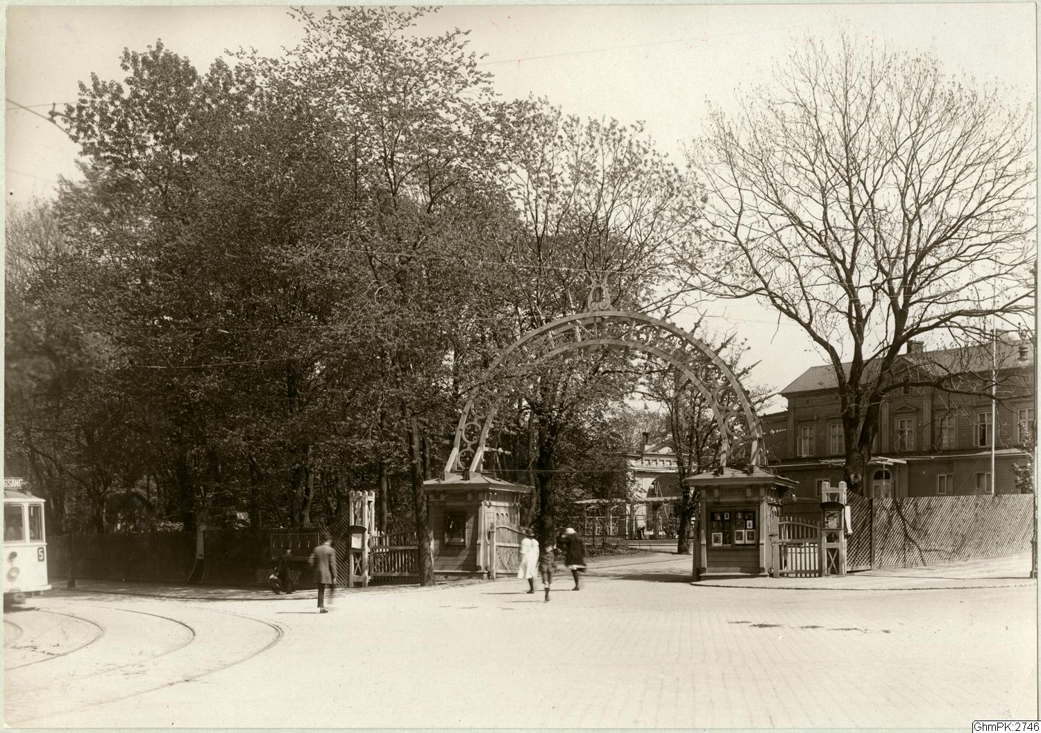 Stora entrén till Lorensbergsparken 1922, efter att Kungsportsavenyen anlagts fram till Götaplatsen. Parkens område i väster minskade för att den nya gatan skulle dras fram.