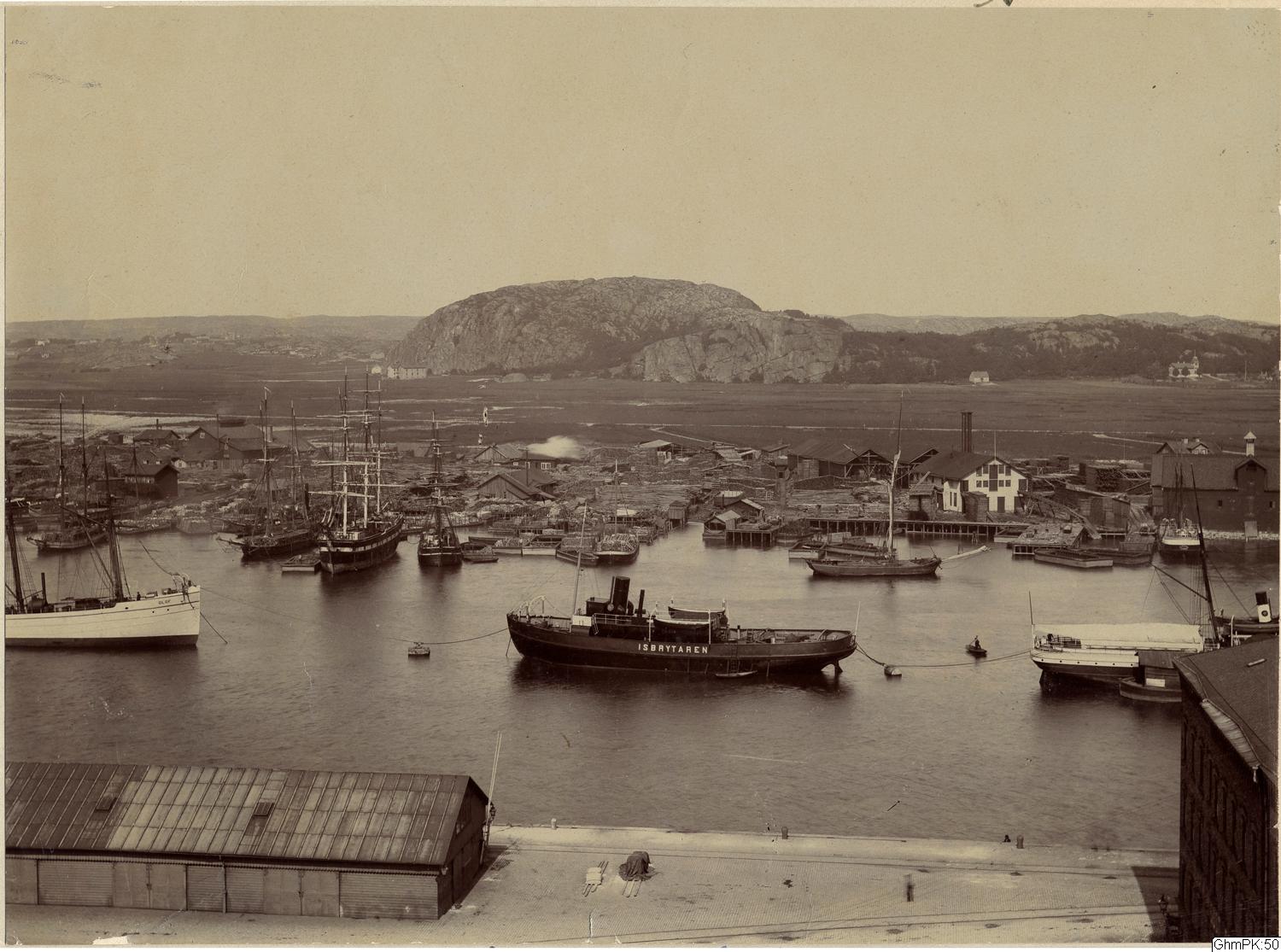 Utsikt över hamnen och Göteborgs Mekaniska verkstad från Stora Otterhällan. I fonden Ramberget och till höger Gillbladska landeriet. Skorstensröken kommer från Andersson & Lindbergs sågverk.