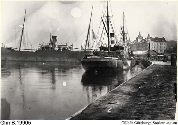 Göteborgs hamn: Masthuggskajen. Foto från omkring 1900. Fastigheten på bilden är Skeppsbron 5-6.