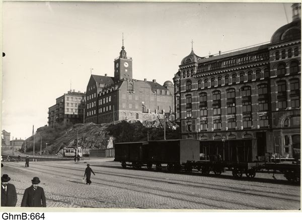 Packhusplatsen med Navigationsskolan i bakgrunden. Foto av Anna Backlund, trol. sent 1910-tal (Navigationsskolan färdigställd 1/7 1916).