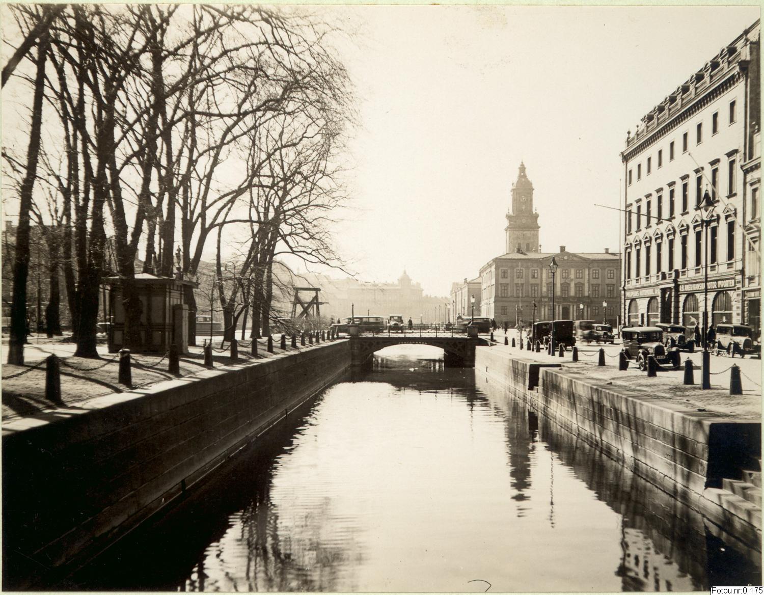 Sträckningsbild med Stora Hamnkanalen mot Göta Älv. Till vänster Brunnsparken och till höger Nordastaden, i fonden tornet på Tyska kyrkan.