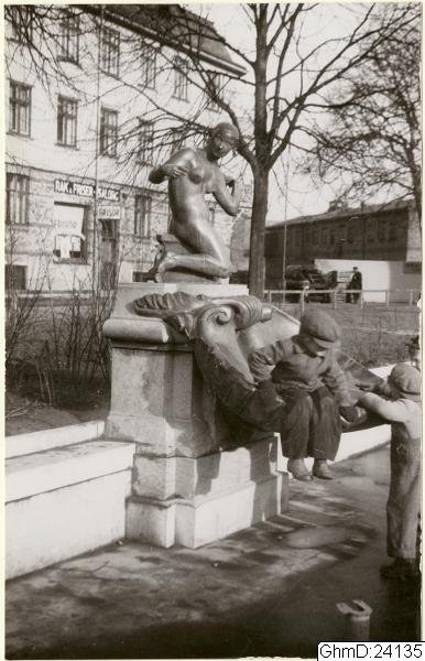 Två pojkar leker i den torrlagda bassängen till fontänen, Susanna, på Kvilletorget.