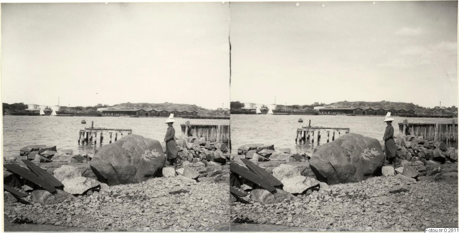 Vy över hamnen och Göta älv vid Röda sten. På Hisingssidan Färjestaden med Oljenäs.