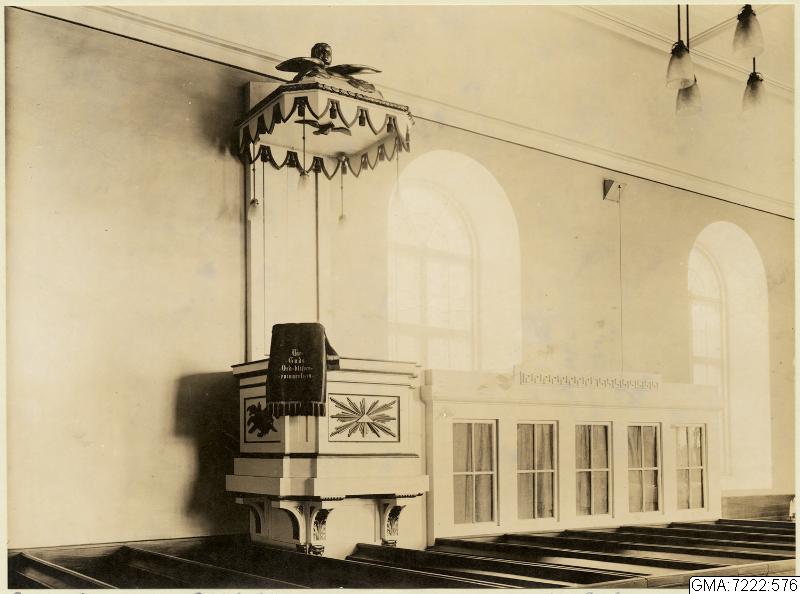 Svartvitt foto av kyrkointeriören med predikstolen i Fattighuskyrkan/Mariakyrkan.