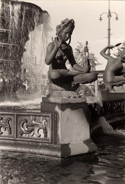 Detaljer av Järntorgsbrunnen. Den främre kvinnofiguren föreställer Asien, den bortre Europa..