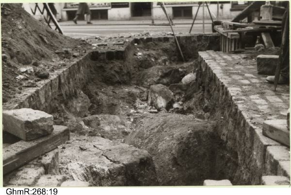 Grundrester av äldre befästningsverk i dagen vid gatuarbeten på Kungsportsplatsen år 1945.