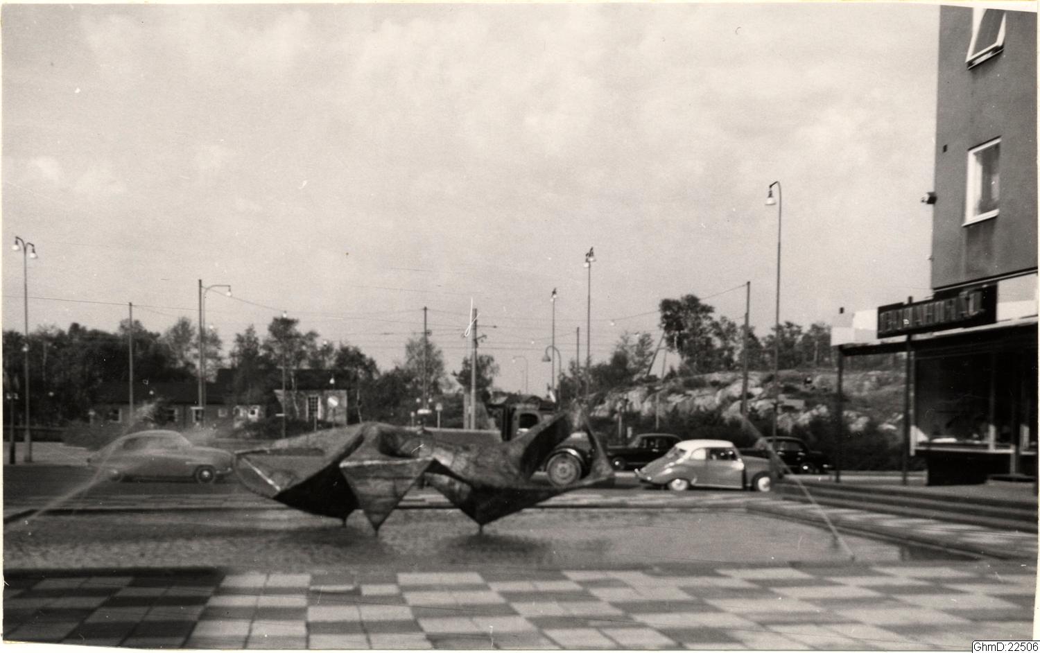 Södra Guldheden, Doktor Fries torg med skulpturen "Fina fisken" som invigdes september1961.