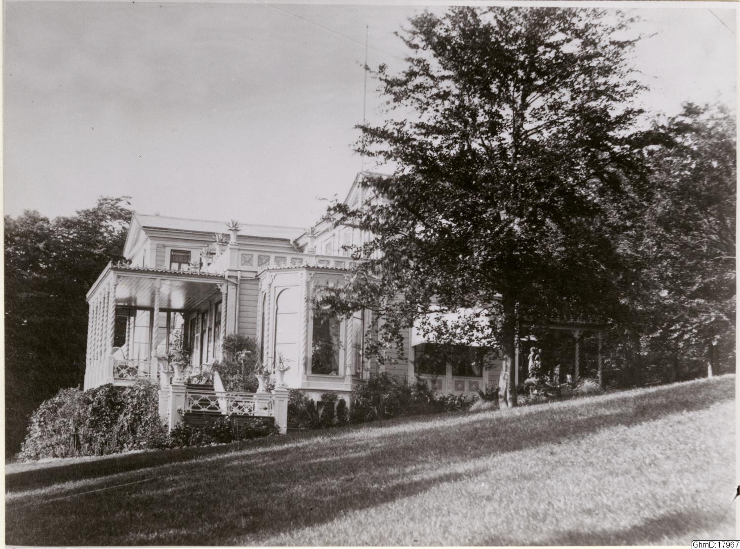 Delar av södra fasaden till Villa Odinslund och verandan mot väster.