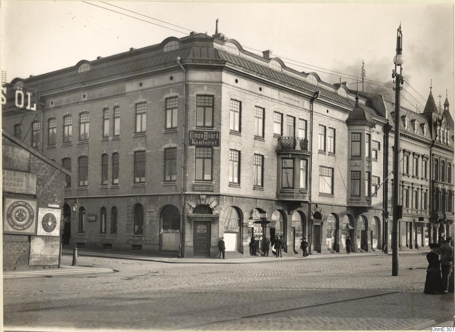 Skeppsbron nr 3, år 1908. Compo-Board Kontorets byggnad uppförd 1899 enligt fasadtext.