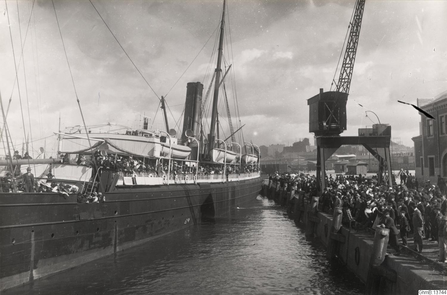 Emigrantfartyget Rollo lämnar Göteborg. Ett av Wilsonlinjens fartyg som gick mellan Göteborg och Hull.