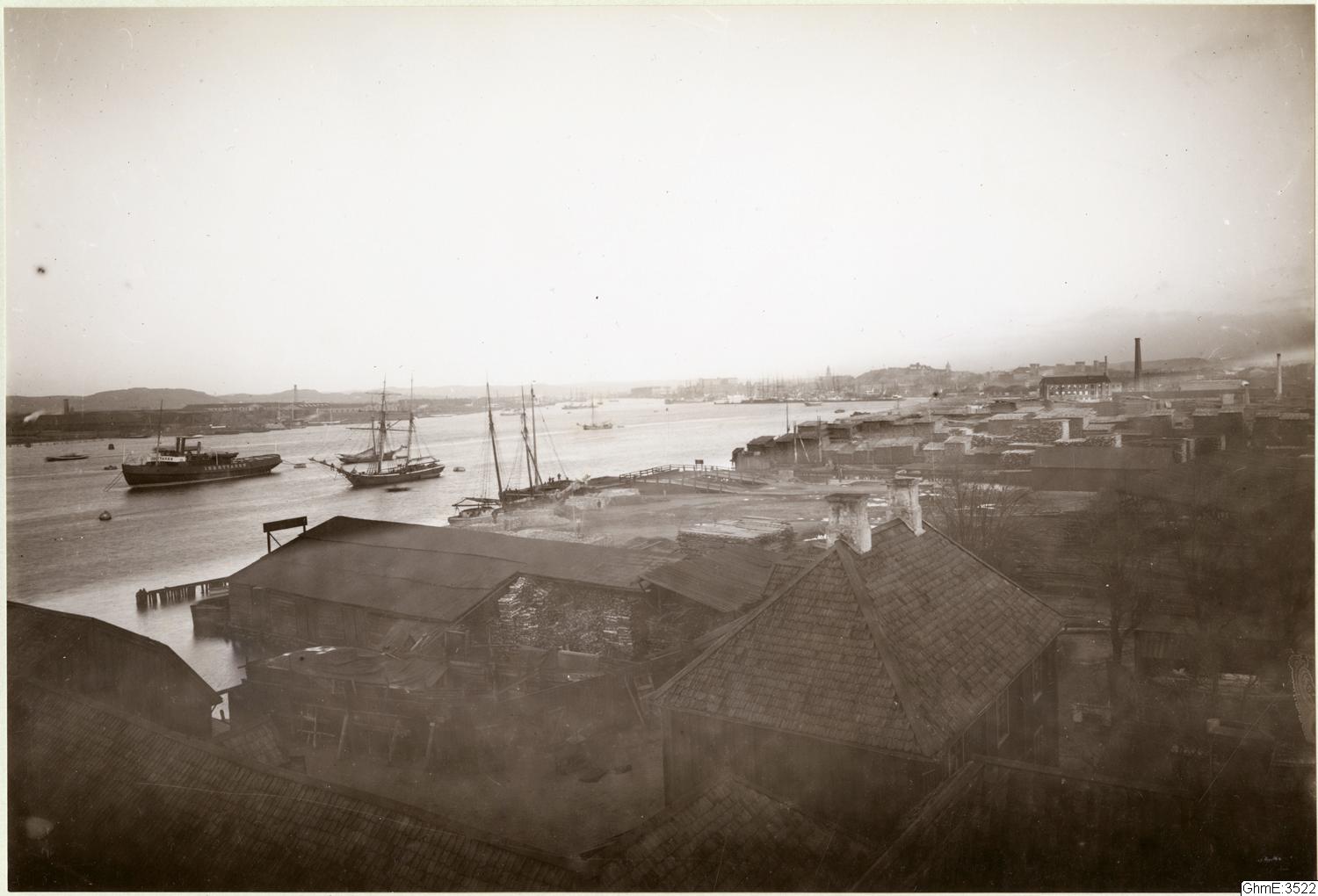 Vy från Stigbergsliden, i förgrunden Wollinska huset och Wollinska hamnen. Göta älv och Göteborgs hamn mot norr. I fonden innerstaden.