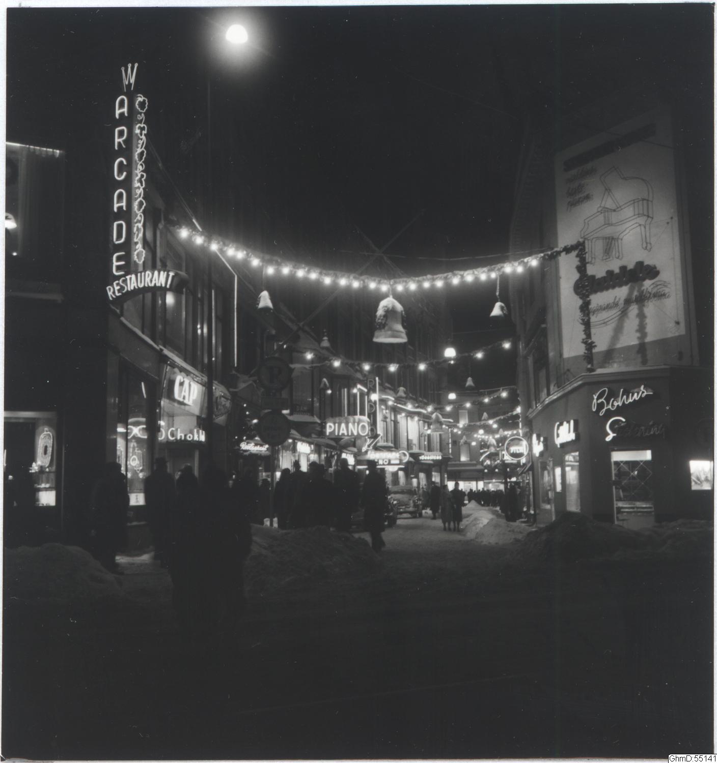 "Arkaden i kvällsmörker", julen 1955. Längs med Arkadens juldekorationer och butiker syns människor som strosar längs gatan.