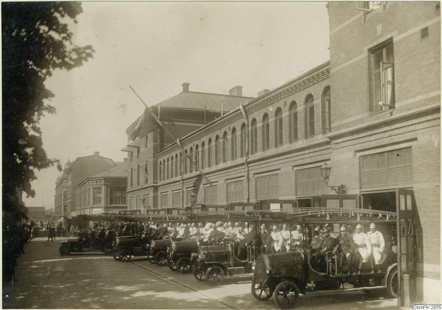 Huvudbrandstationen vid Nordhemsgatan vid brandkårens 50-årsjubileum år 1922.Bilden tagen mot norr, nära korsningen Nordhemsgatan och Fjärde Långgatan.