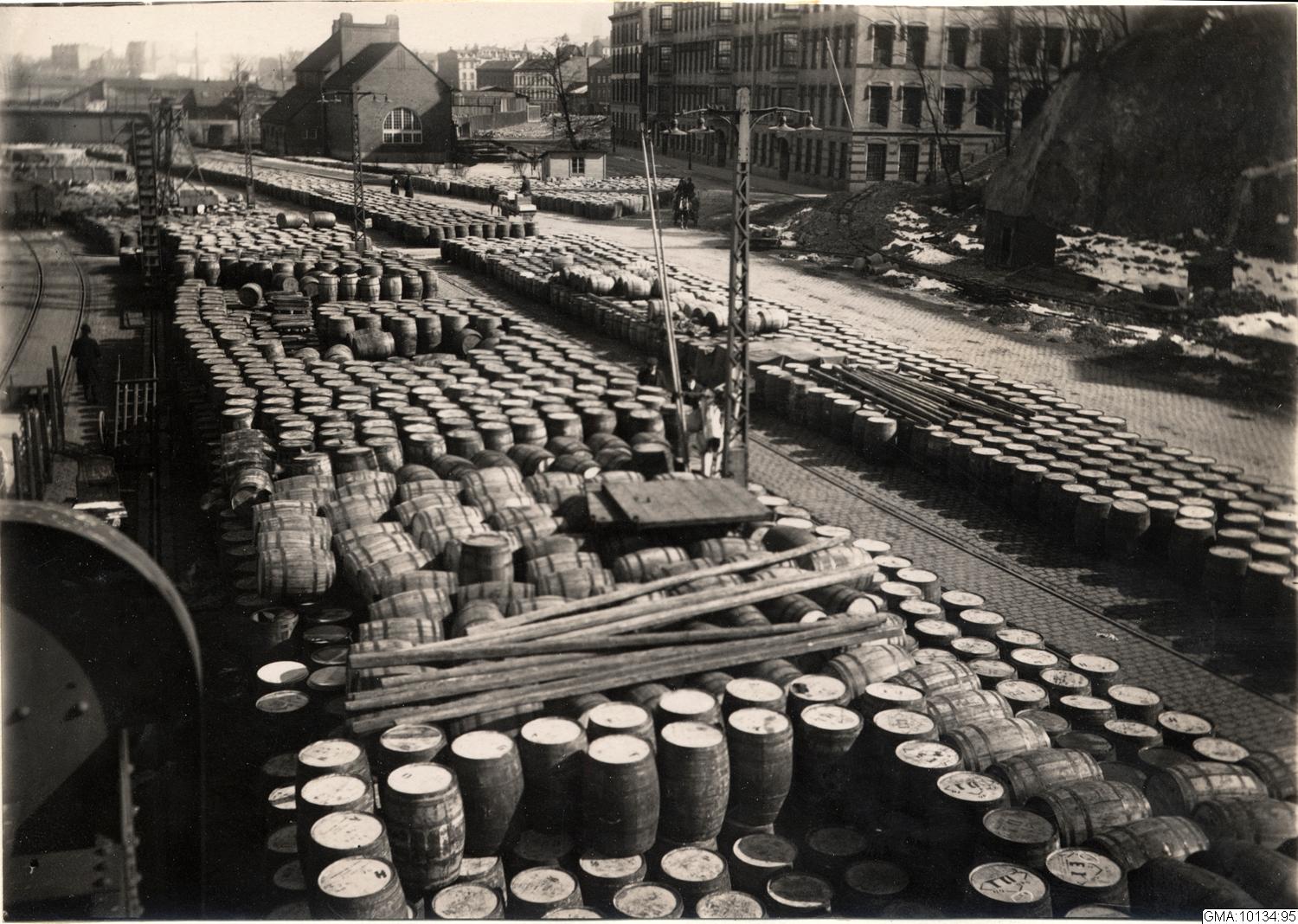 "Sirap och oljor i hamnen. En talande bild till den stora importen." Åren efter första världskriget, troligen.