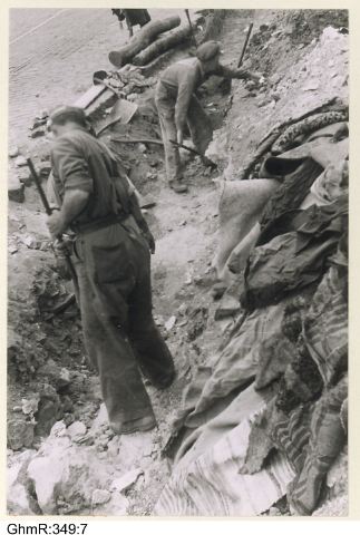 Schaktgrävning på Västra Hamngatan på platsen för den forna bastionen Carolus Dux. Genombrytning av bastionsmurens övre del. Foto från NV.