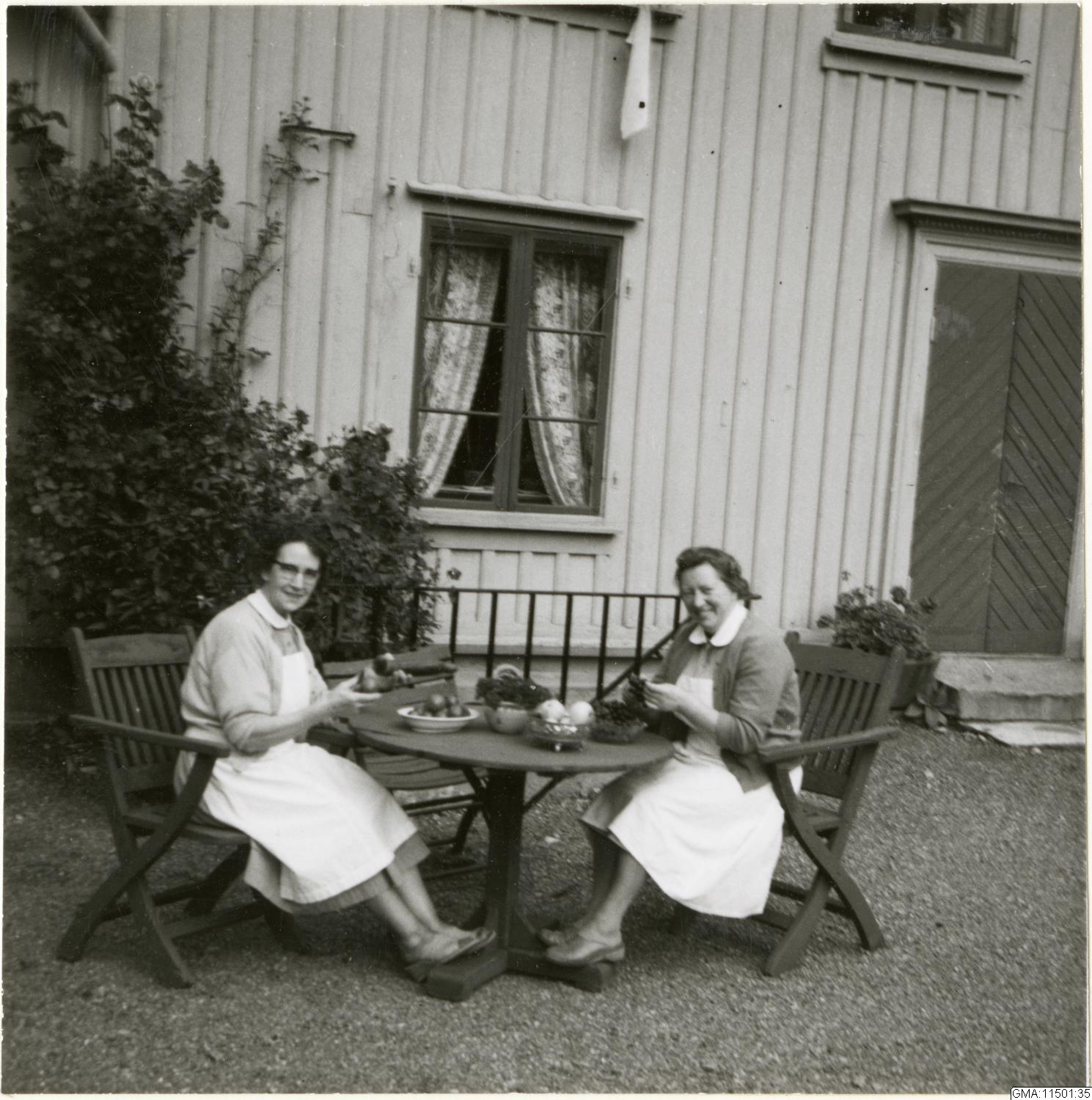 Olga Lundgren och Olly Olsson sitter utanför boningshuset på Lilla Änggården och arbetar