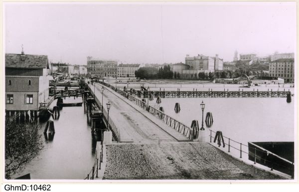 Foto visande utsikt från Hisingsbrons norra fäste mot Nordstaden. På bilden syns bl.a. Cellfängelset vid S:t Eriks torg, Kvarnberget m.m.