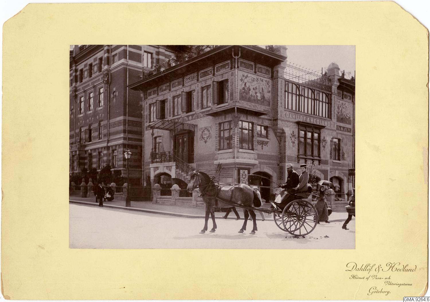 Svartvitt foto, monterat påljus gul kartong. Ekipage med häst och vagn framför Tomtehuset.