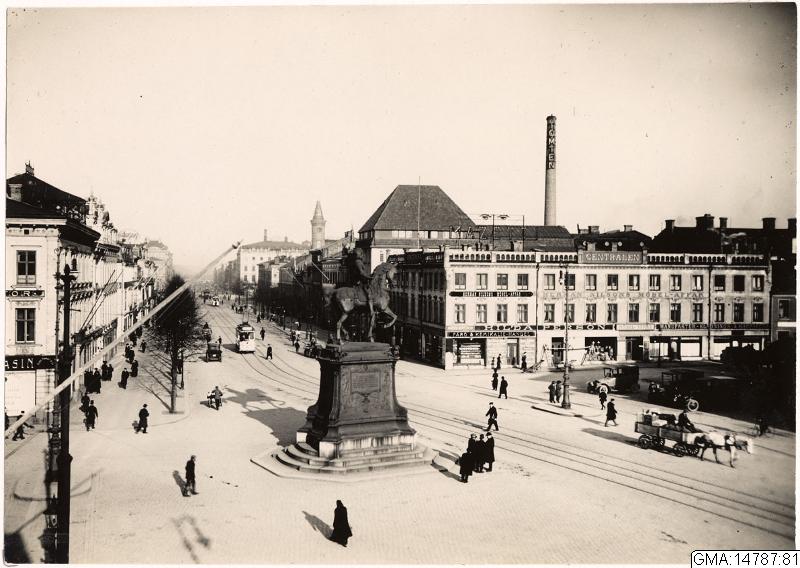 Svartvitt fotografi Kungsportsplatsen med Karl IX:s staty, taget norrut. Man ser Arkadens torn i fonden.