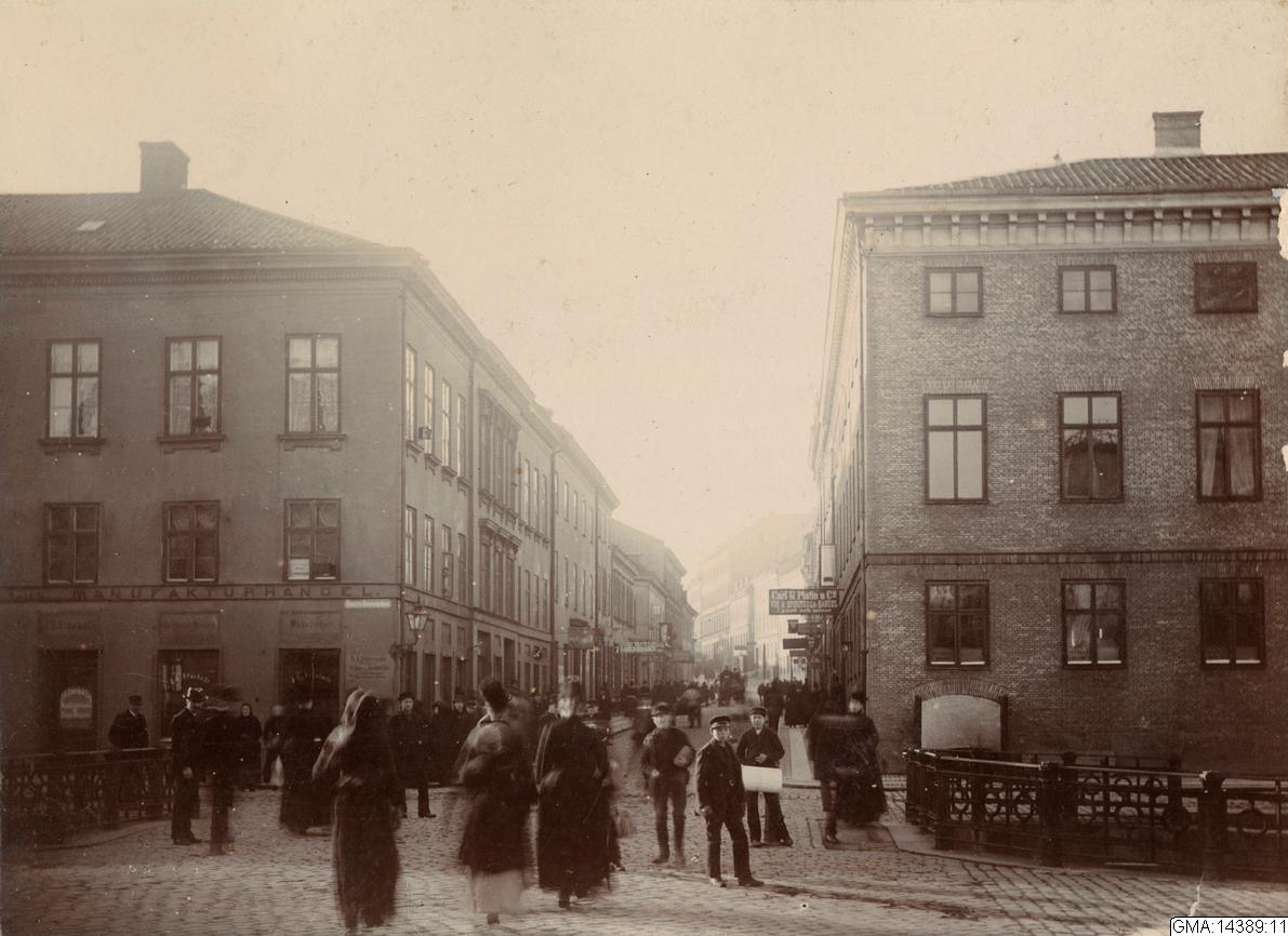 Sträckningsbild med Kungsgatan mot väster, i förgrunden bron över Östra Hamnkanalen. Till höger i bild The Royal Bachelors Club. Bilden tagen från Östra Hamngatan östra sida.