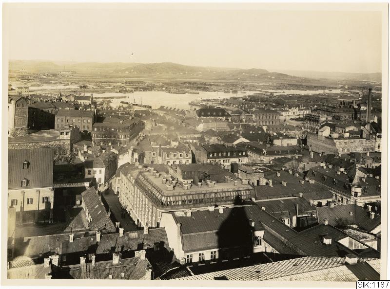 Översiktsbild, tagen från Tyska Kyrkan mot sydöst med Göta älv med verksamhet på bägge sidor om älven och medHisingen i fonden. Till höger i bild syns Västgötabanans vita stationshus och lokstallar.