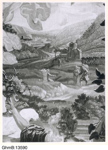 Detalj av gobeläng, gåva till Göteborgs Museum år 1952 av dir. Osvald/Oswald Arnulf-Olsson. Avsedd att pryda Rikssalen i Kronhuset.