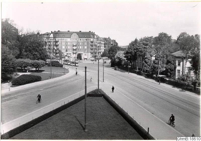 Svartvitt foto. I förgrunden korsningen Eklandagatan (till vänster) och Södra Vägen (till höger). I bakgrunden Korsvägen. Foto Göteborgs konstförlag 1935.
