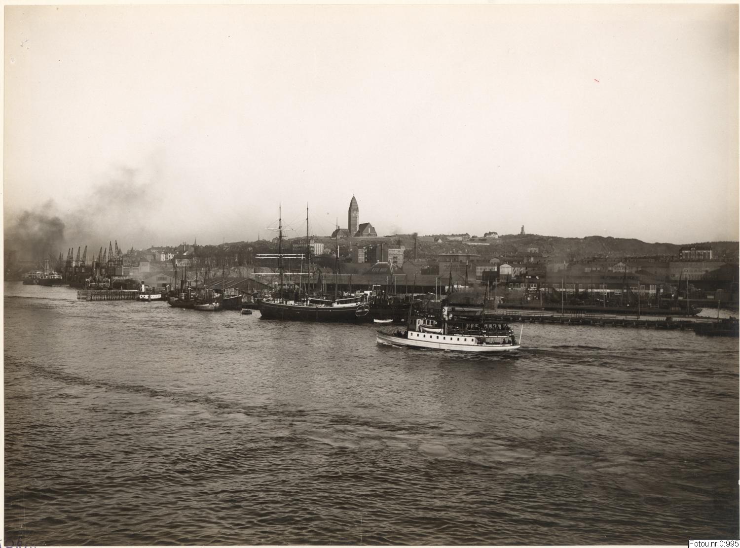 Vy över Göteborgs hamn med Stigbergskajen och Masthugget mot öster. I fonden syns Amerikaskjulet framför hamnkranarna och på Stigberget Masthuggskyrka