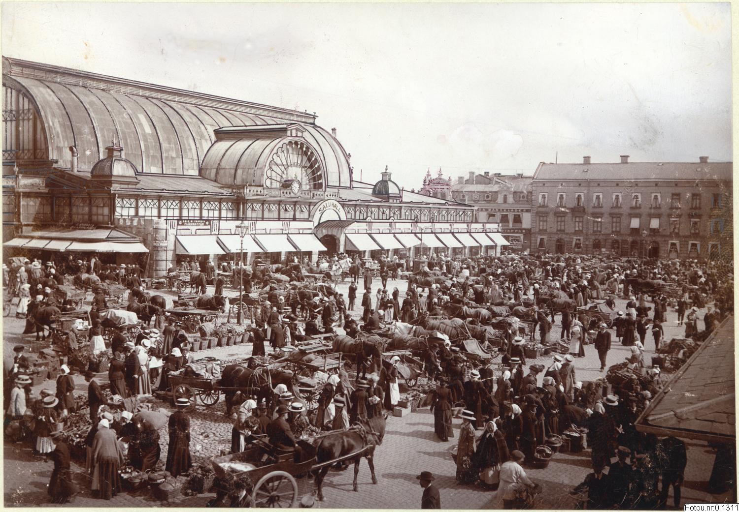 Kungstorget en marknadsdag. Troligen 1 oktober, på den så skallade Fardagen en traditionell markandsdag. Fardagen förr en dag då man kunde byta arbetsgivare och anställningar gällde ofta på ett år i taget.