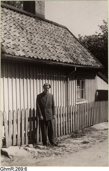 Majornas 3 rote, nr 55. Södra fasaden. Framför huset dess ägare (en sjöman).