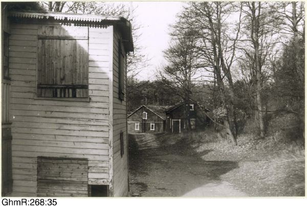 Kärralunds herrgård: närmast detalj av huvudbyggnaden - utbygge på östra fasaden. I bakgrunden ekonomilängor. Blick norrut.
