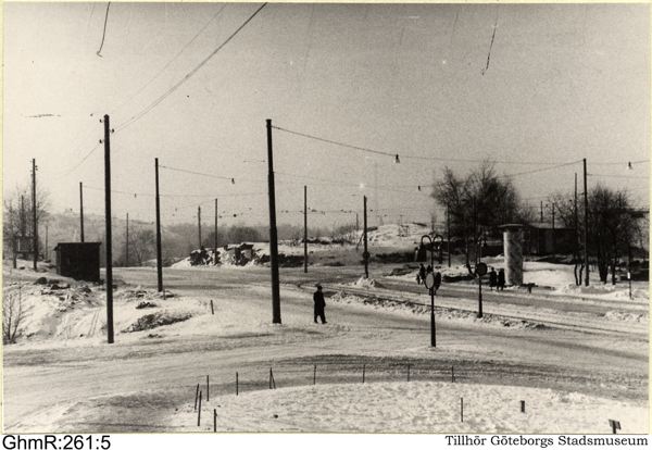 Guldhedsgatan vid ändstationen för spårvägslinjen Kviberg - Landala (linjen senare utsträckt till Sahlgrenska sjukhuset).