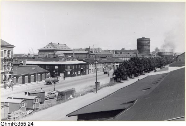 Utblick mot norr över Hultmans holme med Mårten Krakowgatan i förgrunden, från Götaälvbrons nedfart åt söder.