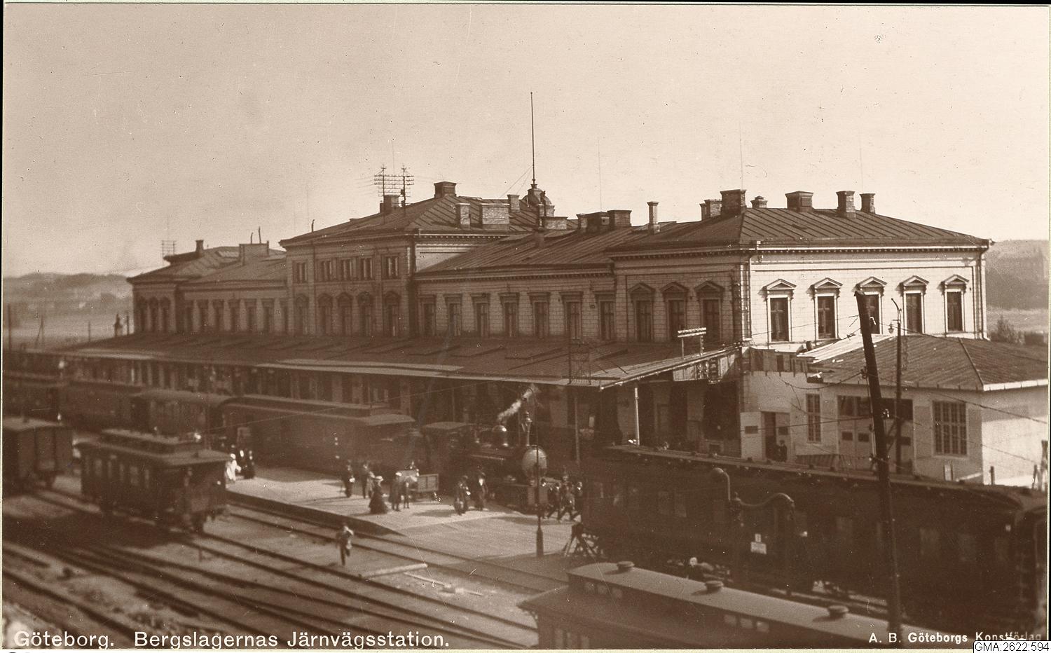 Vy över Bergslagarnes järnvägsstation mot öster med stationshus och spårområde.