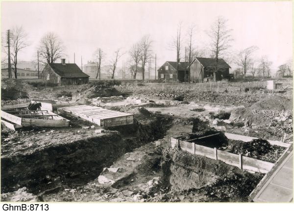 Fastigheten tillhörande bebyggelsen "Marielugn". Bilden tagen under de pågående Nya Lödösegrävningarna. Grundmurar av den äldre stadskyrkan, mot nordväst.