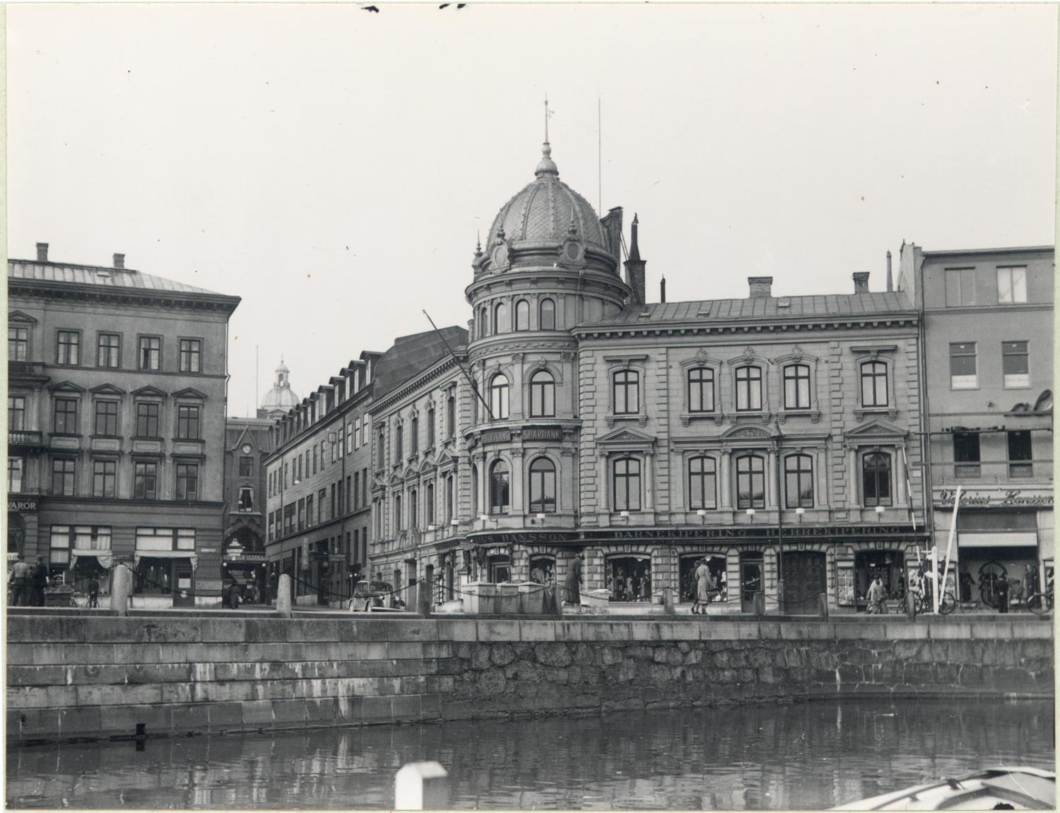 Grönsakstorget och Vallgraven med Lilla Korsgatan rakt fram och Bazargatan till höger. Blick mot norr.