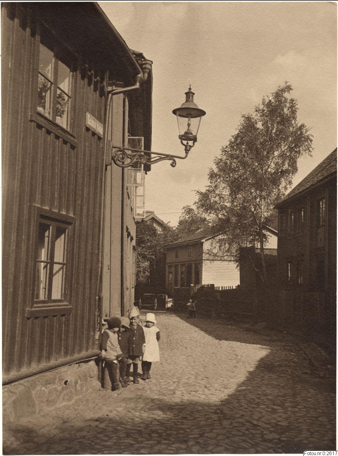 Gröna gatan mot Karl Johansgatan. På gatans högra sida från höger till vänster nr 8 och nr 6. Odaterat.