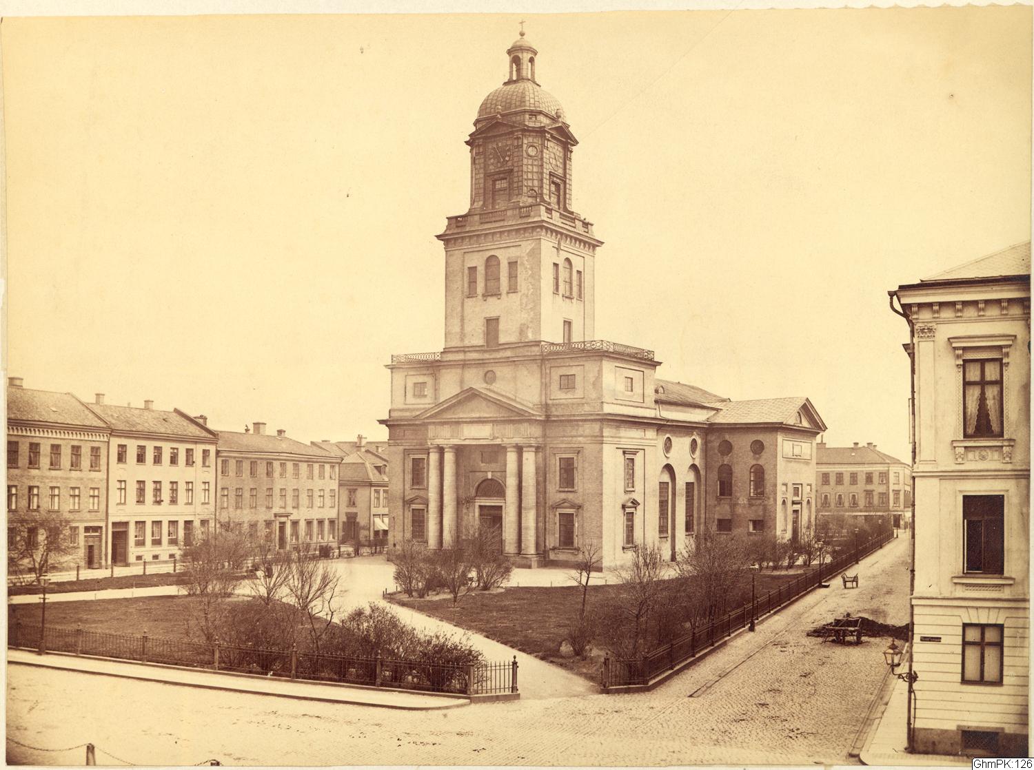 Domkyrkan sedd mot öster, med Kungsgatan till höger och Kyrkogatan till vänster om kyrkan.