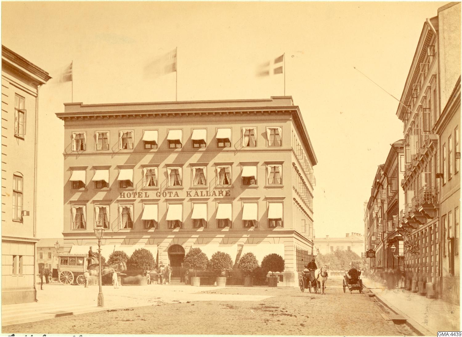 Blick österut längs Södra Hamngatan mot Hotell Göta Källare och intill till höger anas Grand Hotell Haglund.