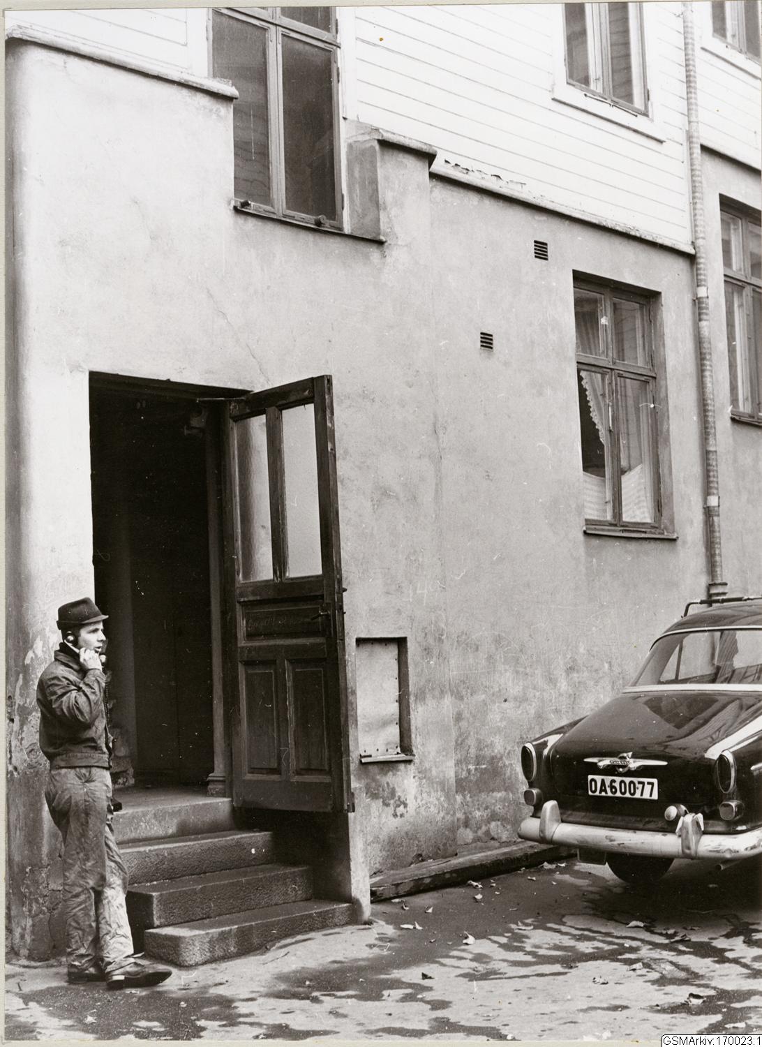 En man som talar i telefon ute på gården, apparaten står i svalen. Intill porten står en blank Volvo Amason.