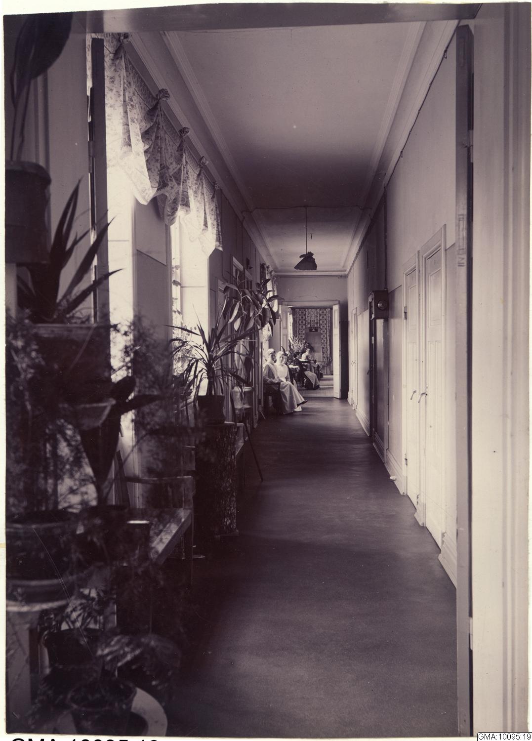 Interiör från Sankt Jörgens sjukhus. Korridor med kvinllig personal längst bort och i rummet innanför sitter två andra kvinnor. Kvinniorna i korridoren kan vara personal.