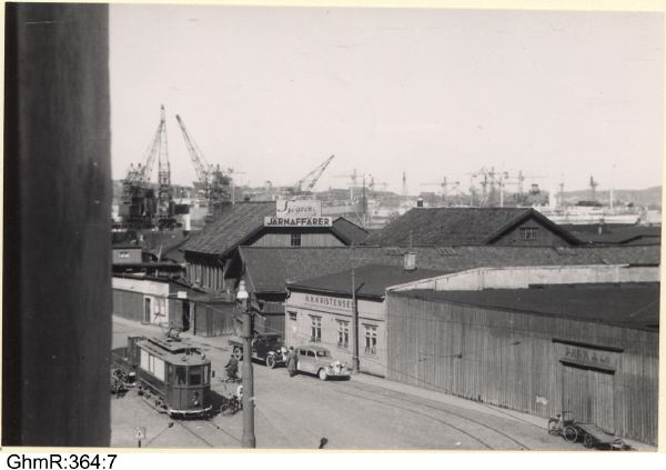 Blick från Lindbergska huset vid Järntorget mot Järnvågsgatan och Järnvågens gamla magasinsskjul.