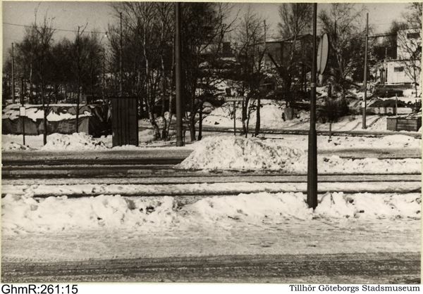Guldhedsgatan vid ändstationen för spårvägslinjen Kviberg - Landala (linjen senare utsträckt till Sahlgrenska sjukhuset).