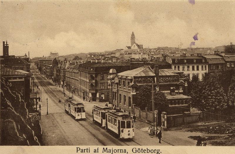 Sträckningsbild av Karl Johansgatan mot öster från Karl Johanskyrkan. Masthuggskyrkan i fonden.