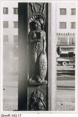Detaljer och reliefbilder på flaggstång vid Gustav Adolfs torg.