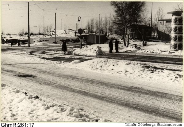 Guldhedsgatan vid ändstationen för spårvägslinjen Kviberg - Landala (linjen senare utsträckt till Sahlgrenska sjukhuset).